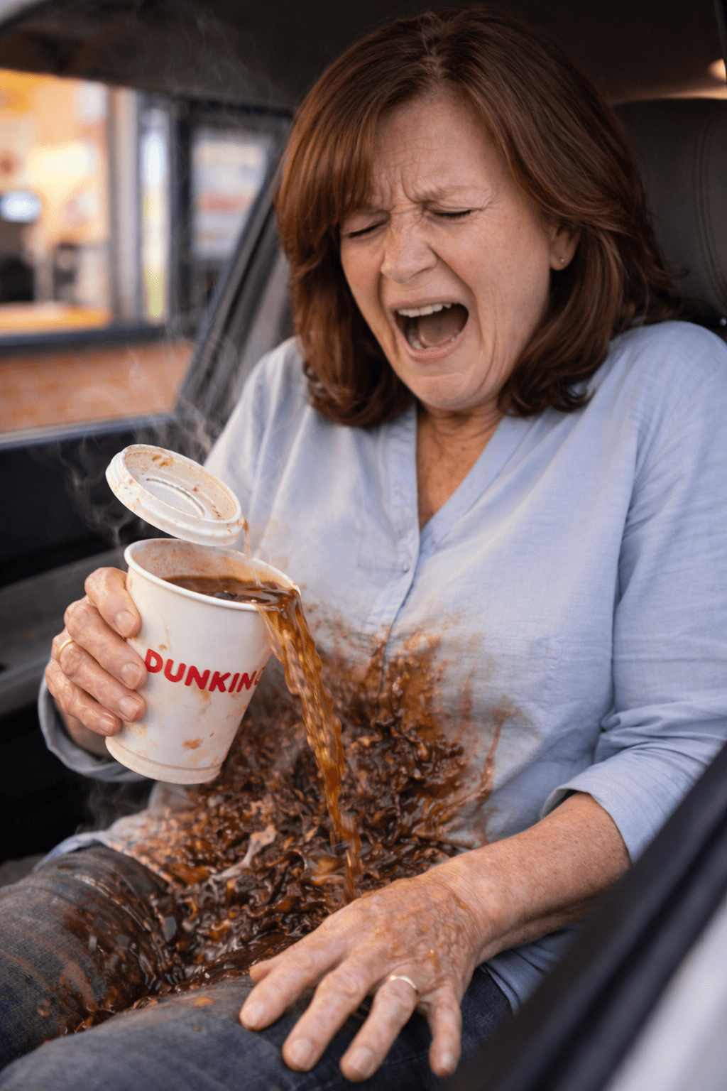 A customer received hot coffee through a Dunkin’ drive-thru window. The cup tipped immediately, spilling coffee onto the legs and feet, resulting in emergency burn treatment and months of recovery. - Liability Factors: