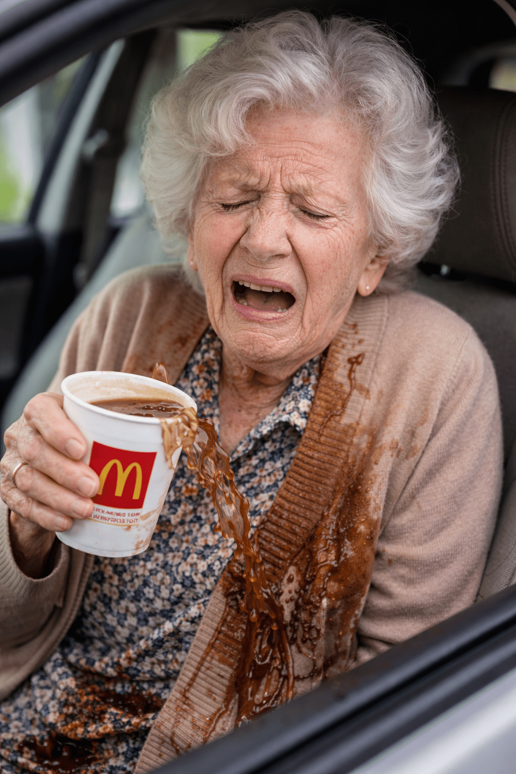 What Happened: Liebeck was a passenger in a stopped car (not driving) and placed a McDonald’s coffee cup between her knees to add cream and sugar. The cup tipped, and the entire 180–190°F coffee spilled into her lap. FindLaw